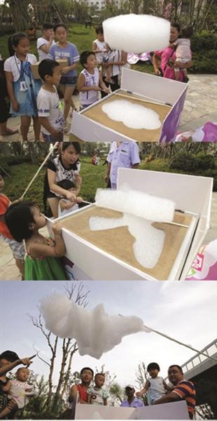 在动画片《哆啦A梦》中,神通广大的机器猫从百宝袋里掏出一个云彩制造机,就造出了像棉花糖一样的白云,如今这一梦想已成现实。这几天,市民发现在郑州市沙口路街头,一朵朵人造“白云”平地而起,引来不少市民围观看稀罕。一时间,星形、心形、棉花糖等各种缓缓飘上天空的“云朵”引来孩子们的尖叫。