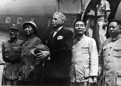 1945年8月,毛泽东、周恩来、王若飞在美国驻华大使赫尔利和国民党代表张治中的陪同下乘专机抵达重庆。