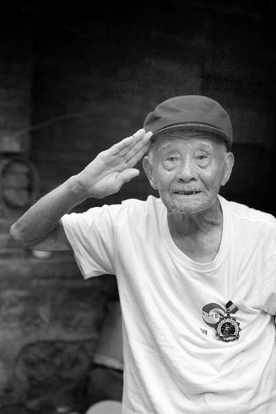 101岁的邵经斗老人在记者镜头前敬了个军礼 摄/法制晚报记者 吴海浪