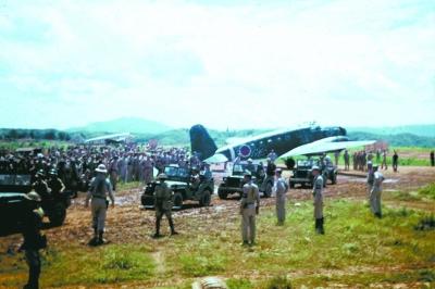 1945年8月21日,日本投降代表降机落地后,乘坐插有白旗的降车驶往指定地点。 新华社发