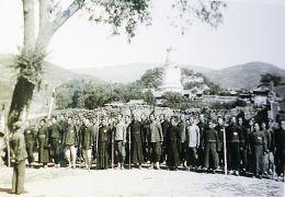 五台山那座著名的白塔傲立在连绵灰色的山脉之中,依稀能看到最远处山顶寺庙的反光。一群僧人站在寺院前,不是在念经拜佛,而是手拿木棍,排列着整齐队伍。一个戴着军帽的人在队伍最前方,僧人们腰杆挺得直直的,目视前方。他们在干什么?这是著名战地摄影师沙飞于1937年冬拍摄于五台山的一幅珍贵历史图片,这里面有着一段传奇的故事。