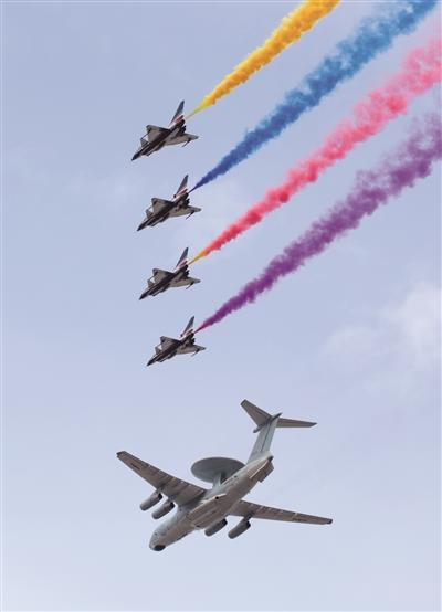 随着最后一个装备方队,也是唯一的女兵方队、白求恩医疗方队通过天安门,由1架空警-2000和8架歼-10A表演机编成的领队机梯队呼啸飞来。担负护卫任务的,是被誉为“蓝天仪仗队”的八一飞行表演队,其中有两名歼击机女飞行员。