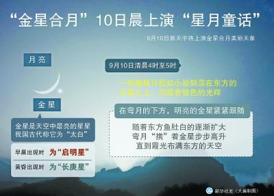 据新华社天津电 10日晨天宇将上演金星合月的美丽天象,届时只要天气晴朗,我国公众可欣赏到“维纳斯”与“月姑娘”约会的美妙情景。