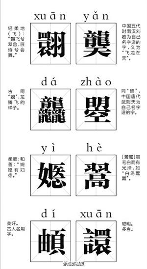 也有生僻字是学生家长所取,该校学生刘翾翯名字就是其母蒋小红所取,对于名字的由来,身为教师的蒋小红称是家人查字典、古书所取。“和那些叫明啊强啊的,显得家长也有点水平嘛。”