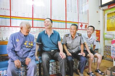 钟老(左一)在体彩网点与孙和平主任(左二)及彩民一起畅谈体彩