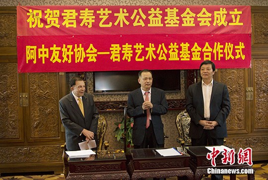 君寿艺术公益基金会成立签约仪式上,阿-中友协主席费尔德曼先生,国际著名画君寿21世纪基金燕东升先生。
