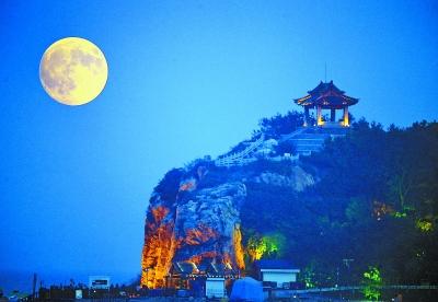 中秋佳节,众多市民与游客来到北戴河海边欣赏超级月亮。