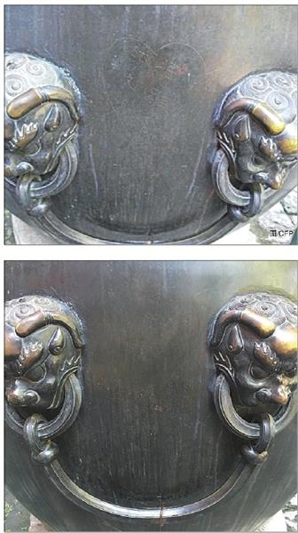 今年9月,这口文物铜缸曾被游客在上面刻心形图案“秀恩爱”(上图),该行为遭到故宫和网友的强烈谴责。昨日,铜缸被破坏的表面已被修复(下图)。新京报记者 浦峰 摄