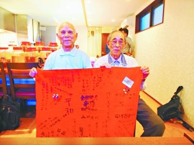 本报日本东京专电(特派记者欧阳春艳)“对,这面旗上有我的签名。那大概是60年前的事了!”9月30日,在东京附近的埼玉县,90岁的本田宣义和86岁的矢作政义抚摸着长江日报记者带来的红色祈愿旌旗,从旗上30多个名字中找出自己的签名,激动不已。这是长江日报记者寻访日本祈愿旌旗以来,再次寻访到在世的签名者。并且第一次,签名者的名字就在已经发现的107面旌旗上。