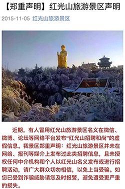 5日,红光山景区官方微信发布声明称,近期,有人冒用红光山旅游景区名义在微信、微博、论坛等网络平台发布“红光山招聘和尚”的虚假信息。我景区郑重声明,红光山旅游景区并未在网络、报刊等媒介上发布过此类招聘信息,且未授权任何中介机构和个人以红光山名义发布或进行招聘活动,请广大群众切勿相信,以免上当受骗。如您已受到诈骗威胁请您及时报警,避免遭受更严重的损失。