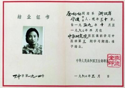 1959 年,屠呦呦成为“中医研究院西医离职学习中医班第三期”学员。在持续两年半的脱产学习中,她不但掌握了理论知识,而且参加过临床学习。根据自己的专业,屠呦呦还深入药材公司,向老药工学习中药鉴别及中药炮制技术,并参加北京市的中药炮制经验总结,从而对药材的品种真伪和道地质量以及炮制技术有了感性认识。
