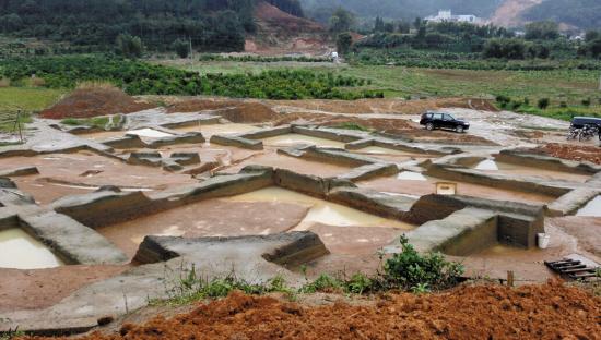 古墓葬群遗址位于城口镇锦江河附近一处山坡。羊城晚报记者在现场看到,山坡上的植被和表层土壤均已被完全清理,十几座长方形墓葬分散在山坡和坡底平地位置。由于天降小雨,工作人员忙着给一处中部坍塌的券顶砖室墓遮盖防雨布,又大又厚的青砖上布满菱形花纹,经考古人员指引,记者在几块青砖上发现有阴刻文字,可惜年代久远,字迹漫漶不清,连专业考古人员都难以辨识。