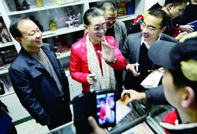 身穿红色唐装的章金莱一到现场,就引发了现场所有集邮迷的手机、相机“围观”。