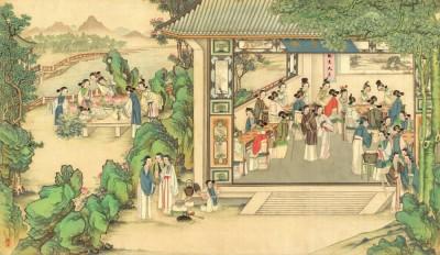 《红楼梦》堪称中国古代的一部“百科全书”,图为荣国府里花团锦簇,宝玉同众姐妹饮酒作诗题对。