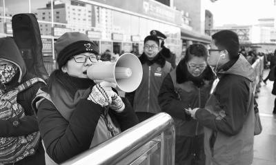 2016年春运大幕已经拉开。图为志愿者在北京西站站前广场为旅客服务,倡导文明出行。新华社发