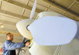 ■拉-11飞机螺旋桨安装完毕,工作人员正在做涂装前最后一次打磨。