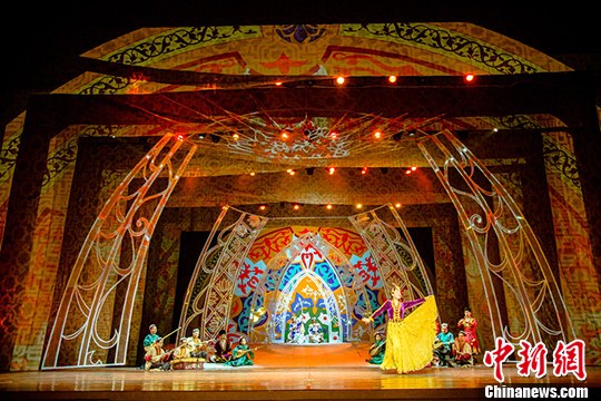 中新社上海5月3日电 (记者 陈静)美丽的天山脚下,热情的维吾尔族小伙和俏丽的姑娘在狩猎中因为保护小鹿相识、相知、相爱;繁茂的花园中甜蜜的情人情意绵满,大巴扎上恋人幸福牵手……神秘、古老,人类口头和非物质文化遗产代表作——木卡姆艺术3日晚在“上海之春”舞台闪亮登场。华丽的服装、奔放的音乐和舞蹈、震撼的视觉冲击,惊艳了全场观众。