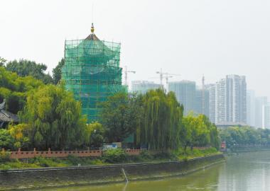 15日,记者来到望江楼公园,但成都的地标——立于江边、朱柱碧瓦的崇丽阁却难寻踪影。原来,它的外侧已搭起脚手架,正在进行封闭维护。
