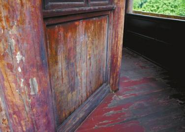 15日下午两点,立秋后的成都,太阳依旧“毒辣”,气温近35℃,湿热难耐。这样的天气,望江楼里犹如“蒸笼”。3楼的一扇木门前,69岁的陈正发双手各拿一把灰刀,蘸一点深褐色的土漆,用力横竖一刷。