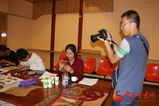 采访团正在观看皮影表演