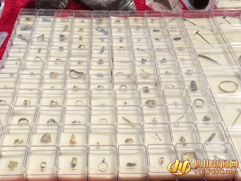 记者在展示现场看到,这次集中亮相的发掘出水的文物种类以金银铜铁等金属材质的器物为主,包括属于张献忠大西国册封妃嫔的金册,西王赏功金币、银币和大顺通宝铜币,铭刻大西国国号的银锭等,此外还有大量戒指、耳环、发簪等各类金银首饰,也有铁刀、铁矛、铁箭镞等兵器,另还有铜锁、钥匙、顶针等生活用具,种类丰富多彩,让人目不暇接。