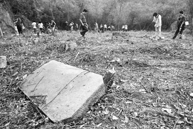 从白面峰下来,一分支路引人走入仙境般的竹林,抬首不见天日,只有山风习习,没多久一弯转过,武当山腰一片开阔之地映入眼帘。当地陪同人员讲,此处名叫牛栏湾,随处可见断碑横卧。一块康熙年间的断碑为我们揭示了湖南武当山的由来,碑文说明,白面峰玄帝殿乃宋代一位道教真人卓昧所创建。