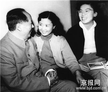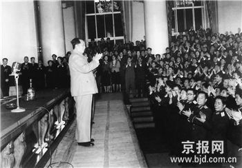 毛主席在谈到国内情况时说:世界上就怕“认真”二字,共产党就是最讲“认真”。这时从大礼堂走廊人群里传出了一个声音:“毛主席,请您不要走,请坐下歇歇。”毛主席微笑着点了点头,坐下来点燃了一支香烟慢慢地吸着。同时把身体向前一倾,问坐在讲台下面最前面的学生的生活情况。