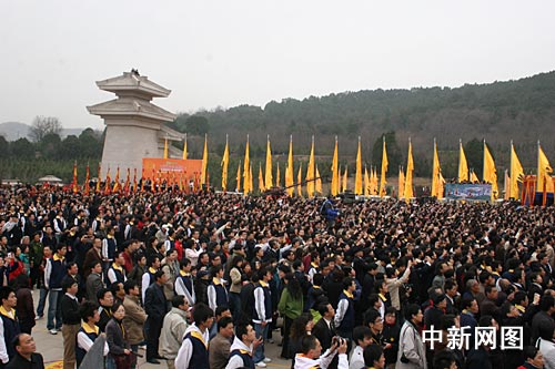 中新网黄陵4月4日电 (朱鹏英)2008年4月4日上午9时50分,戊子年清明公祭轩辕黄帝典礼在陕西黄陵县桥山正式开始,来自海内外的八千多名中华儿女聚集在黄帝陵前,共同祭拜中华民族的"人文始祖"轩辕黄帝,缅怀共同的先祖。