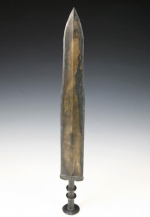 中新网杭州8月26日电(记者龚读法)浙江省杭州市余杭博物馆接收到一把战国时期青铜剑,剑长46.5 厘米,刃宽4.3厘米,分剑柄和剑身两部分。整把剑表面铜锈明显,但看上去刃部仍然比较锋利,在灯光照射下,熠熠闪光。剑柄部分有两道箍,剑身上部呈稍宽状收向剑尖。双面开刃,上设两道箍,剑身扁平,刃部锋利,上端略收,锋部成尖形,剑格呈倒凹字形,素面,为典型的战国青铜剑。