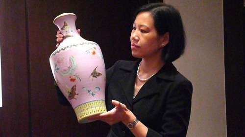 图:曾志芬表示,清乾隆御制“粉红地粉彩轧道蝴蝶瓶”是孤品(大公报摄)
