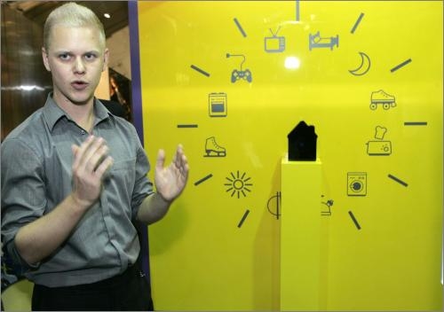 展览中的能耗显示钟、电流显示线以及曾经获得《时代》杂志2006年度最佳创意的“花灯”都是基于让电灵显形的理念创作的。能耗显示钟能实时显示周围环境的用电情况。如果开了洗碗机,它就会立刻在显示器上显示出能耗量。电流显示线则利用发光脉冲、光的流动和强度来显示电器在通电后的耗能情况,用不同的颜色来对人加以警示。和前两者不同,花灯则更像一种对节能者的犒赏,通过无线电控制的花灯在感应到家中能耗降低的时候就会微微展开“花瓣”,灯光也会变亮,而一旦能耗过高,则将自动枯萎——就像是对于世界气候和环境的一个暗喻。