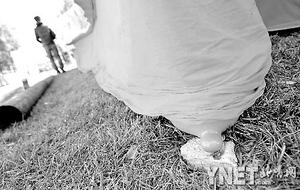 现场:红布遮盖地震雕塑 里面暗藏乳房造型