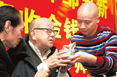 由于学金钱板的演员越来越少,作为国家非物质文化遗产的金钱板已濒临失传。但昨日,85岁高龄的金钱板大师邹忠新收下了一个伶牙俐齿的徒弟——巴蜀笑星“矮冬瓜”林晓东。邹忠新对新徒弟赞不绝口:“晓东川剧底子很扎实,他一定能从众多师兄弟中脱颖而出,最大限度展示金钱板的魅力!”