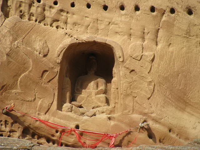 中新网11月20日电 据国家文物局网站消息,陕西省志丹县日前在洛河沿岸的石崖窝内新发现了一处摩崖造像,窟龛拱形顶,高1.2米,宽1米,深80厘米,造像为一铺三尊,正面为一佛,两侧为站立的文殊、普贤二菩萨,佛像面、颈部狭长,梳高肉髻,结迦趺座,基本不见衣纹的雕刻,只有一根突出的博带垂至腿部。菩萨造像与佛像相同,只有腰和带饰,没有过多的衣纹刻画,各自脚下卧着一只青狮和白象。窟龛外两侧各浮雕一个肌肉健硕、形态夸张的持剑力士,呈奔跑状。