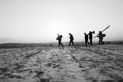 王水龙戏班外出演戏,走在空旷的雪地上,他们的身影有些孤独。