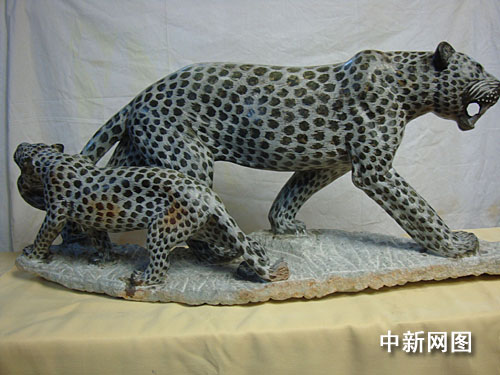 非洲匠人用5年时间打磨出来的等比等高“母子豹”石雕。