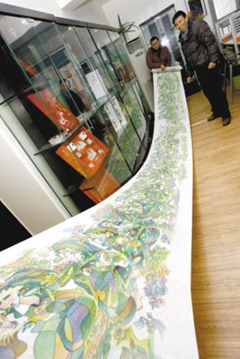 6年前,重庆民间画师卢祥万开始专注于创作“一笔画”,即只用一根连续不断的线条来表达。去年7月,他决定要在101米长的纸上创作名为《春之韵》的作品,申报吉尼斯世界纪录。昨天,卢祥万在位于江北观音桥的工作室给记者展示了这幅快完成的画作。他指着窗外23层高的楼房说:“从房顶直到地面,这幅画也不能完全展开。”