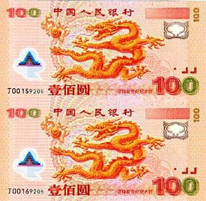 为了迎接新世纪的到来,中国人民银行于2000年发行了迎接新世纪千禧年双龙纪念钞连体钞,装帧册的发行量为10万册,面值为200元。