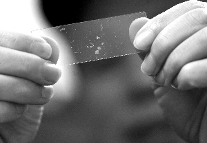 在办公室中,潘彪教授小心翼翼地取出一个纸盒子,盒子上有“木材树种取样标本”的字样。打开盒子,掀开一层棉花,几块玻片整齐地叠放在一起。凑近了看,记者才发现里面只有星星点点般的木屑,袖珍得可怜。“这就是取回来的样品?”记者有些失望。“是啊,就这些还花了几个钟头才找到的呢。”潘彪捏紧两片玻片,嘱咐记者憋住呼吸,别把这些木屑吹散了。“你只要哈一口气,就能把这些宝贝吹走。”