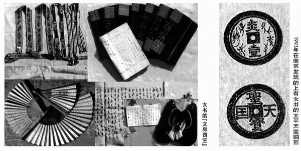 尤其令人惊喜的是,1993年在南京发现了一枚太平天国铜币,上面竟有女书字“天下妇女,姐妹一家”!史料记载,当年太平天国曾在道县江永一带扩军数万。很可能就有懂女书的“女兵”也跟着“女营”打到南京,成了高位“女官”。(详见新编《江永县志》及2000年3月2日《人民日报》海外版)女书是对男尊女卑的旧制度的文化抗争,从山沟写到京城,从纸书、扇书、帕书写到太平天国的铜币上,虽然只是彗星一闪,却蕴含一种质的升华。