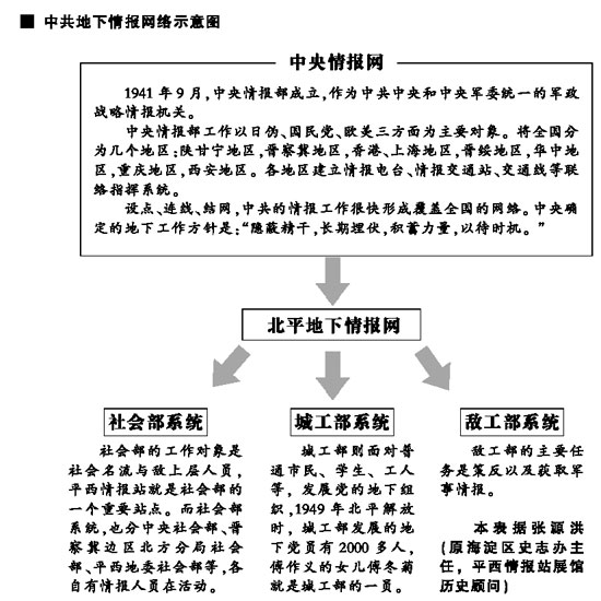 电视剧《潜伏》热播、北京市第一个以情报战线为主题的展馆开馆……今年以来,以地下党、情报战为题材的影视作品开始成为大家关注的热点。近日,本报记者探访了战争时期的情报站点原址,采访了部分在北平从事情报工作的地下情报人员或者其家属,通过地下情报人员鲜为人知的故事,为大家展现一个真实的隐蔽战线。
