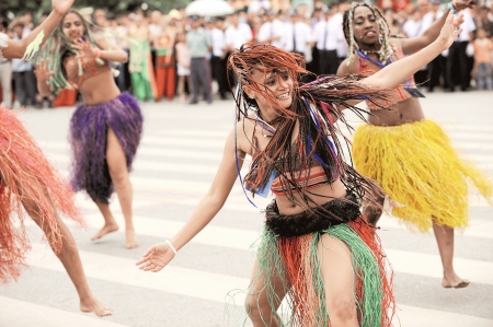 第二篇章“异国风情”中,毛里求斯和巴基斯坦表演队排练得很投入,当头戴红花、身着艳丽花朵大摆裙的非洲美女一上场,便吸引了现场男士们的视线。伴随着欢快的音乐,姑娘们翩翩起舞,不停摆动小蛮腰来回旋转舞动,撩动裙摆露出迷人双腿,她们脸上的太阳、月亮图腾展现了原始的舞蹈魅力。除了这两支队伍,哥伦比亚民间舞、苏格兰风笛、俄罗斯民间舞、泰国舞也将亮相天府大巡游。