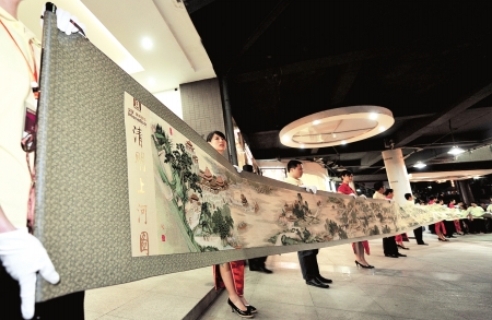 经过37位设计师1年半时间的研发,18位专业高级绣师历时180多天、巧夺天工的绣制,长22米的《清明上河图》十字绣,昨晚在成都首次公开亮相。这幅特殊的十字绣总共使用了116505米绣线,共计2032611针,重达20600克,是目前世界上最长的十字绣艺术品。18位技师从2008年7月20日起开始绣制,至2009年1月20日完工,共绣制人物814人,动物83匹,船只29艘,房屋楼宇30多栋,车13辆,轿8顶,桥17座,树木180棵,人物往来衣着不同,神情各异,栩栩如生。作品将在第二届非物质文化遗产节上正式展出。