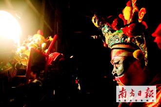 如同闯入一个有魔力的磁场,“啊咿嗳……”的喊唱先让人心头一惊,一个小生以高亢的嗓音开场了,这嗓门夹杂着从夜空积蓄来的力量,雌雄莫辨,清亮如童声。奇的是,他开头18个字足足唱了5分钟……这一百转千回的唱,撕裂了村里的宁静。