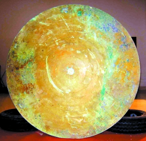 昨日下午,记者在阳江市文广新局文物科冯志兵副科长的带领下,来到放置“周亨铜鼓”的地方。记者看见“周亨铜鼓”体形硕大,厚重,鼓面宽平,边缘伸出鼓颈外,鼓身束腰呈反弧形,上面还黏着细细的泥沙,因为常年掩埋底层,铜鼓表面已经出现斑驳的铜锈。而鼓面和鼓腰上镂刻着精美的细纹,鼓面正中间镶有八道光芒四射的太阳纹。