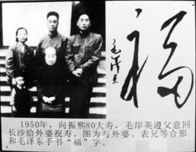 1950年,向振熙80大寿,毛岸英遵父意回长沙给外婆祝寿。图为其与外婆、表兄等合影和毛泽东手书“福”字。