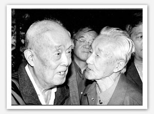 在一次活动上,久未见面的周汝昌(右)和季羡林相见甚欢