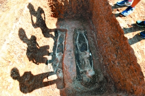 这片墓地位于密云县冶仙塔下。昨日下午3时左右,刚挖出来的4个墓穴成“田”字排列,每个墓穴被挖出一个5米见方的土坑,土坑里是棺形穴。被挖掘出的白骨静静地躺在墓穴里。据悉,考古人员清晨来到现场,10时前带走了3袋古物。