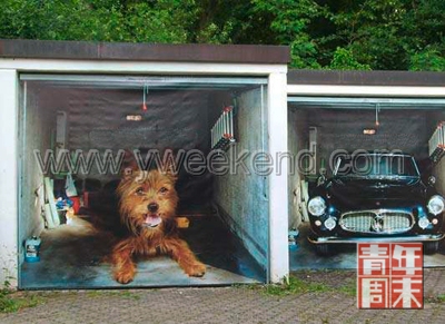 德国画家灵机一动,教人们将3D画安在车库的卷闸门上,于是车库铁门——除了防盗以外没有任何意义的设备——突然令人产生了无限的猜想和好奇,几乎变成了主人家最神奇的一处美景。