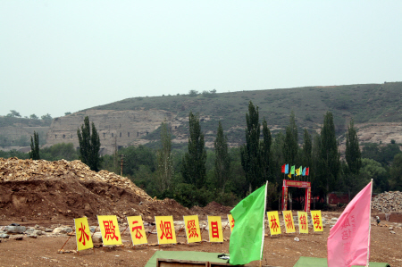 指挥部门前正是将要新建的“山堂水殿”。一个巨大的土坑已被挖掘开,土坑中央的楼体框架拔地而起。这将是一个有着8万平方米水面的人工湖,湖的中央是供奉烟火的寺庙。